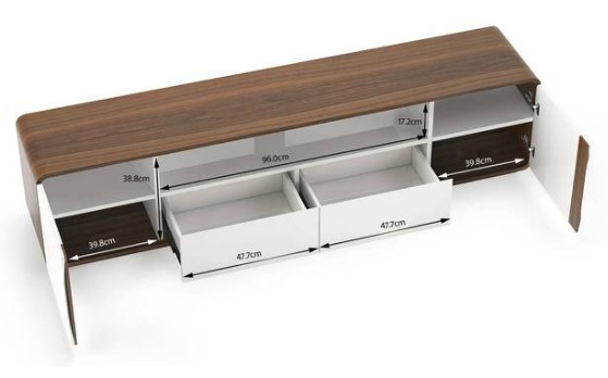 • A delight in white. The pristine whites and the walnut detailing give it an ethereal look. Two drawers pull out smoothly, allowing easy access to your knick-knacks. One shelve sit atop them, housing your entertainment units and display-worthy curios.