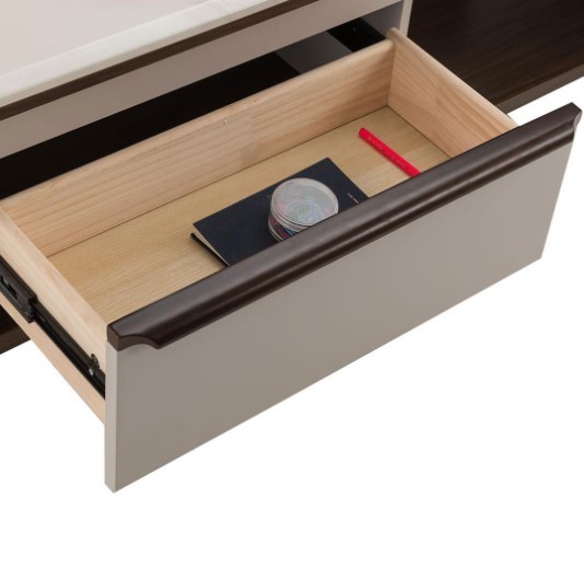 The perfection of marble finish and solid wood makes the TV unit a statement piece. Perching on the wooden tapered legs, the glossy tabletop stuns with its distinctive veins. While an extendable base dramatically reveals a shelf with a gentle pull.