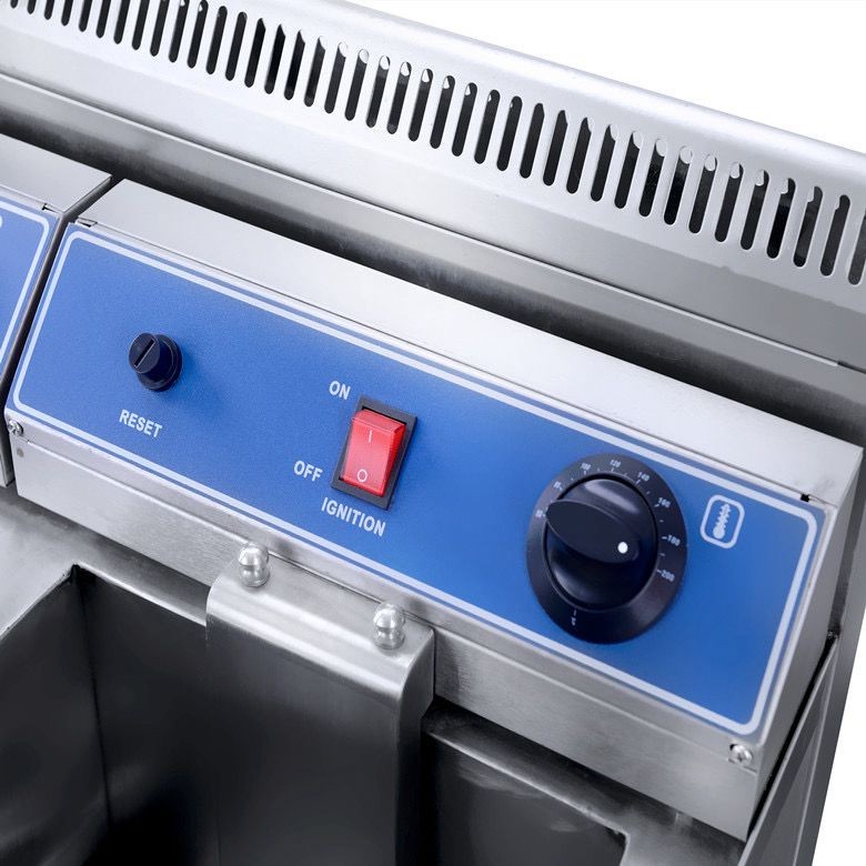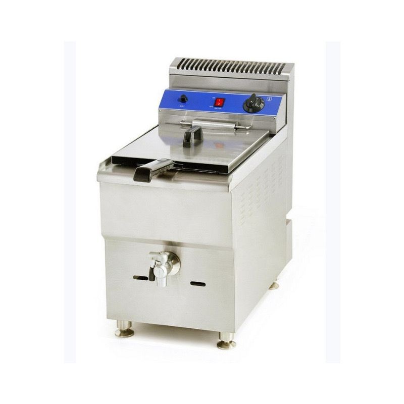 Get a commercial gas fryer with stainless steel body, auto control, 1 tap, 18ltr capacity, upto 190°C temperature, & removable pan and body.