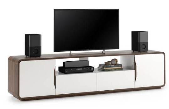 • A delight in white. The pristine whites and the walnut detailing give it an ethereal look. Two drawers pull out smoothly, allowing easy access to your knick-knacks. One shelve sit atop them, housing your entertainment units and display-worthy curios.