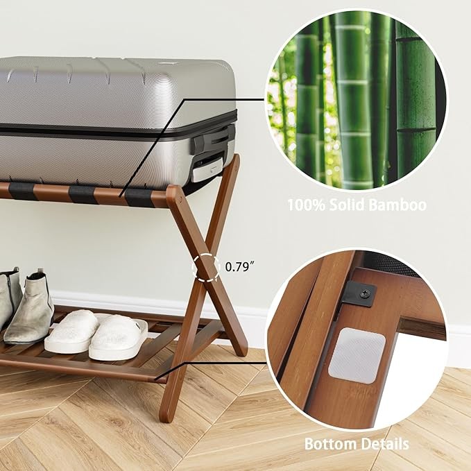 Fully Assembled Walnut Bamboo Luggage Rack with Shoe Shelf, Folding Suitcase Stand with 5 Heavy-Duty Straps