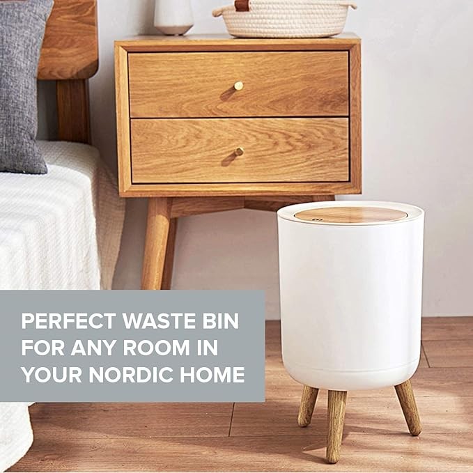 • ELABORATE DESIGN - Designed with white housing, round can lid and wood grain high feet, looks compact and elegant, both a garbage bin and a indoor decoration.