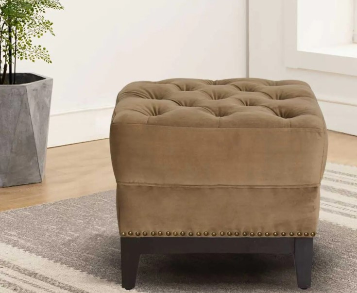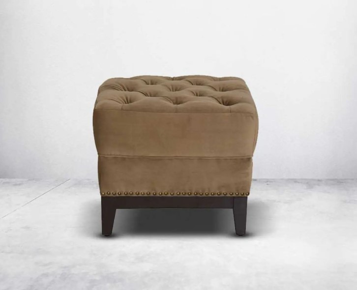 Ottoman upholstered in velvet fabric fully tufted with walnut wood legs which offers a contemporary glamorous touch highlighting your decor space.