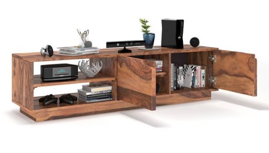 • Two shelves and two cabinets hold all your AV equipment and other odds and ends
